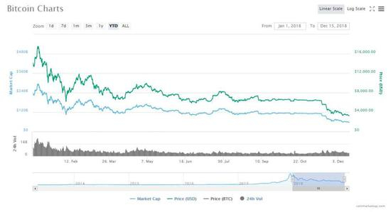 今年以来,比特币震荡下挫,今年的崩跌与去年的暴涨行情形成了鲜明对比,去年初价格还不足1000美元,但此后一路飙升,涨幅超过2000%,最高曾触及19511美元。但今年,比特币已较历史峰值狂泻逾八成。