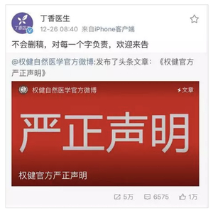 但愤怒的不止是网友,还有权健公司。公司官微发文指责这篇文章不实,表示将“通过法律途径维护自身合法权益”。“丁香医生”则强硬表态,“对其中的每个字负责”,随后宣布收到了权健公司的律师函,愿意走司法程序。