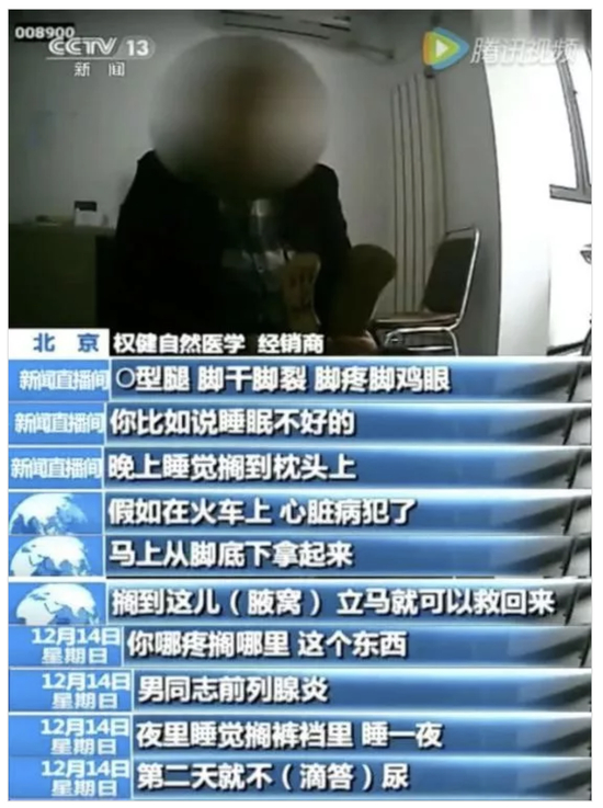 在媒体现有的报道中,我们看到年销售额200亿的权健是这样卖货的:售价千元的鞋垫垫在脚下能矫正罗圈腿,抽出来放枕头上能治疗失眠,夹在腋下能治突发心脏病,搁在裤裆里能治前列腺——
