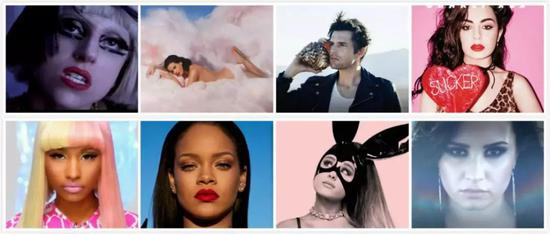由左至右、由上及下分别为Lady Gaga, Katy Perry, The Killers, Charli XCX, Nicki Minaj, Rihanna, Ariana Grande, Demi Lovato