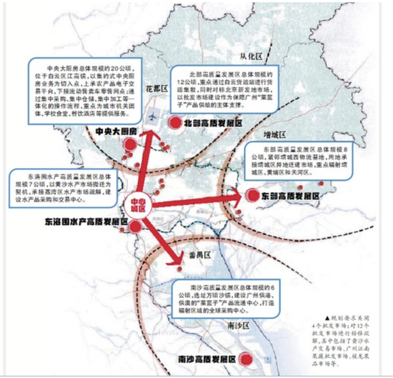 规划提出,严格控制“菜篮子”产品批发市场建设用地规模,提高土地利用效率,扩大有效供给。规划全市“菜篮子”产品批发市场建设用地规模约149公顷,较现状减少37公顷。立足广州、服务港澳、联动泛珠三角,总体形成“5+X”的“菜篮子”产品批发市场布局,包括北部高质量发展区、东部高质量发展区、东洛围水产高质量发展区、南沙高质量发展区和中央大厨房5个高质量发展区和多个手续齐全符合规划的存量市场。