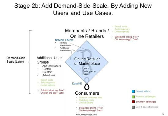 一旦有了一个运行的基本平台,你就会开始想要创建额外的需求端规模,即用户、参与度和数据(创建平台的核心资产)的增长。如果你经营的是电子商务平台,那你需要的就是数据网络效应(在消费者方面)。
