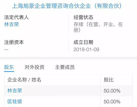 每日经济新闻(微信号:nbdnews)记者注意到,上海旭豪是有张庭老公林瑞阳(林吉荣)、匡桂媛各持股一半;同时林瑞阳还担任上海远昶的法定发表人。