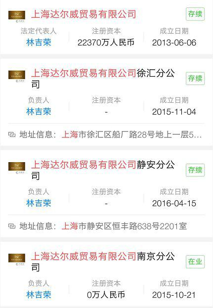 工商信息显示,上海达尔威成立于2013年6月,注册资本22370万元,所在的行业为批发业。其法人代表和董事长为林吉荣,这是林瑞阳的另一个名字。公开资料显示,公司注册了庭秘密、Tin‘Secret 、TST等与张庭夫妇所做微商产品相关的多个商标。