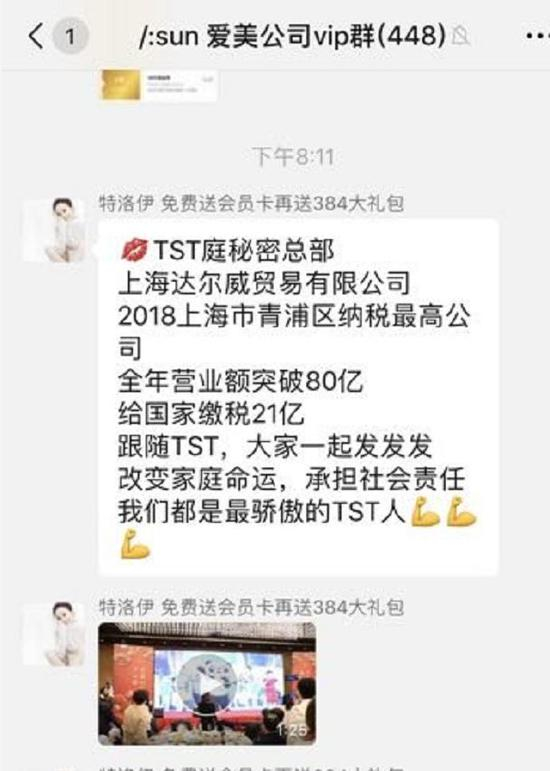 作为青浦区“纳税百强”,上海达尔威2018年度的纳税额虽尚无权威定论,但凭借微商生意登顶青浦区的,其营收规模引人关注。事实上早在2017年,上市公司山东华鹏(603021)曾发布公告指出,上海达尔威当年前三季度实现营业收入36亿元,实现净利润11.43亿元。此外,TST西南大区负责人阿紫在其微博的个人简介中写道,“西南大区旗下800余家集团公司,每月零售销量破4亿,总销量突破80亿。”