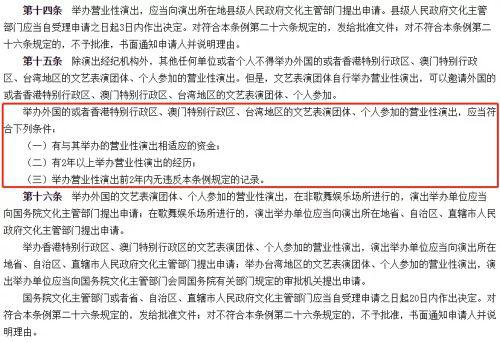参考我国2005年9月1日起实施的《营业性演出管理条例》,涉及外国艺人的演出要求主办方为正规演出经纪机构、具有2年以上营业性演出举办经历,此外还需文化报批,且演出场地满足相关要求。
