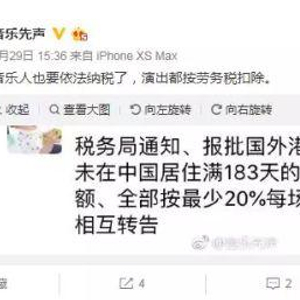 近日,有演艺行业从业者表示,接到税务局通知,需要报批国外及港澳台艺人(即非大陆艺人)在大陆进行演出的应纳税额。其中,未在中国居住满183天的艺人不享受免征税额,按每场最少20%的比例缴纳。