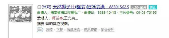 检索专利查询平台也可以看到,柯兰亭与王光兴曾共同是10多个外观设计专利的发明人,且柯兰亭为第一发明人,包括申请于1988年、早期的椰汁罐装招纸装潢,不过这些专利多已无权、届满或更正。