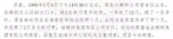 就在1999年3月4日下午,柯兰亭到椰树集团办公区,准备向集团时任党委副书记反映证据时,突然被2名男子猛砍,身上共12道刀伤,缝合100多针。当时,柯兰亭被砍案得到当地领导的高度重视,随即立案侦查,但直至2014年,该案仍未破获。