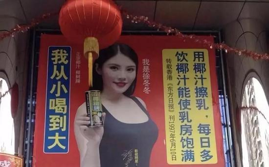 “早晚一杯,白白嫩嫩”的文案和土味配色如旧,但多了位丰腴美女以迷之姿势举起椰汁,身旁还有配文——“我从小喝到大”。