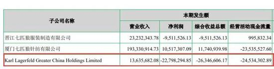2017年,中国服装企业七匹狼花了3.2亿元人民币,投资“老佛爷”的同名品牌Karl Lagerfeld及其在上海的公司。七匹狼2018年上半年的财报却显示,Karl Lagerfeld亏损了2280万元左右。