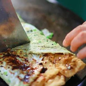 煎饼的制作工艺简单,将调和好的面糊放在烧热的鏊子(一种古老的制作面食的工具)上煎制成圆形的薄饼,放入馅料即可。