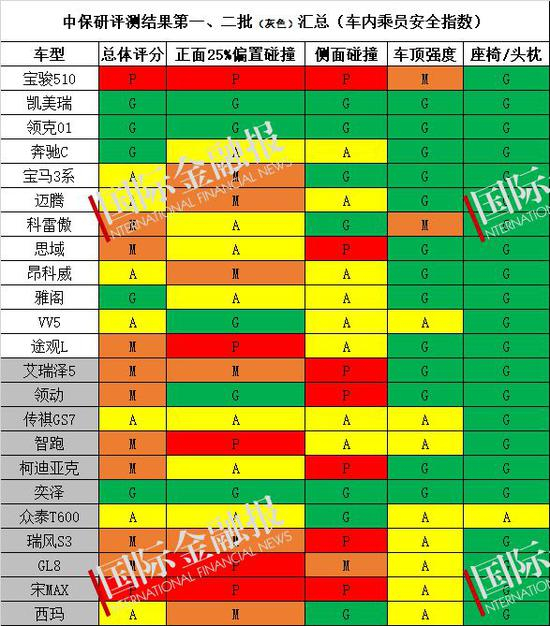 在中保研的第二批测试中,新增加了耐撞性与维修经济性测评,结果除斯柯达(G级)、一汽丰田奕泽(A级)以外,剩下的9款车型——北京现代领动、东风悦达起亚智跑、上汽通用别克GL8、东风日产西玛,还有自主品牌奇瑞艾瑞泽5、广汽传祺GS7、众泰汽车T600、江淮瑞风S3、比亚迪宋MAX“全是红色”,几乎全军覆没!