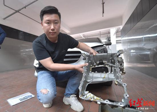 16日下午,红星新闻记者和佟先生来到成都武侯华星锦业汽车销售服务有限公司,在维修车间见到了佟先生的车以及损坏的发动机油底壳。“我们对事件的描述是,发动机受损。”店内售后服务经理骆先生说道。