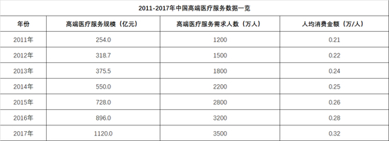高端医疗服务的市场规模到底有多大?数据显示,目前国内大概有3000万-5000万人群有高端医疗服务需求,而且这种需求每年都在增加。高端医疗服务行业市场规模快速增长,从2011年的254亿元增长到2017年的1120亿元。
