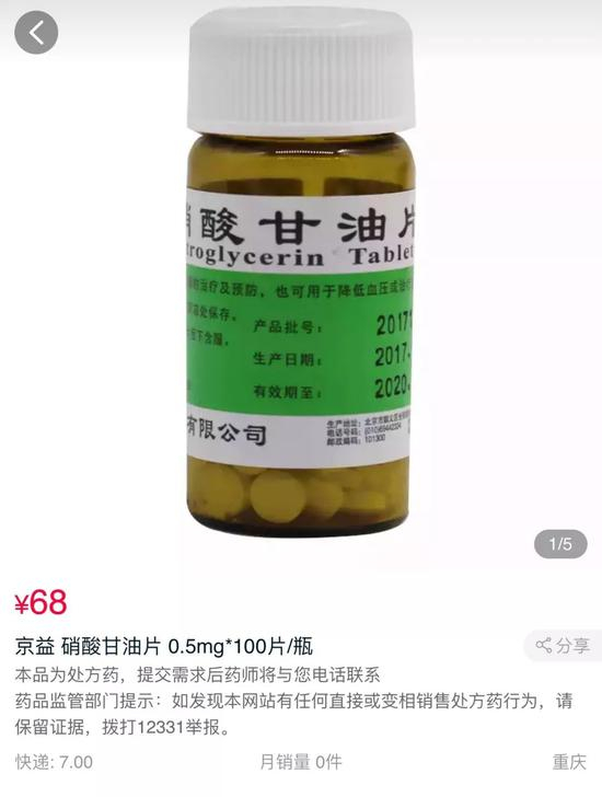 ▲100粒/瓶硝酸甘油价格 来源:网上药店