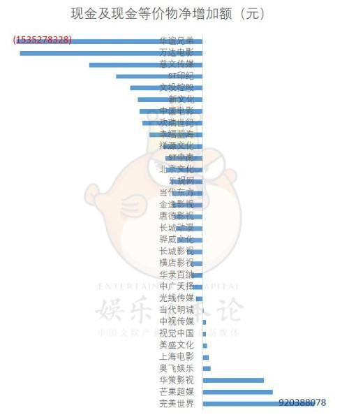 我们一看现金流——完美世界(002624,诊股)、芒果超媒(300413,诊股)、华策影视(300133,诊股)、上海电影(601595,诊股)等9家公司现金流状况良好,但大部分上市公司现金流都出现大幅下降,其中华谊兄弟、万达电影(002739,诊股)、慈文传媒现金及等价物流失幅度最大。