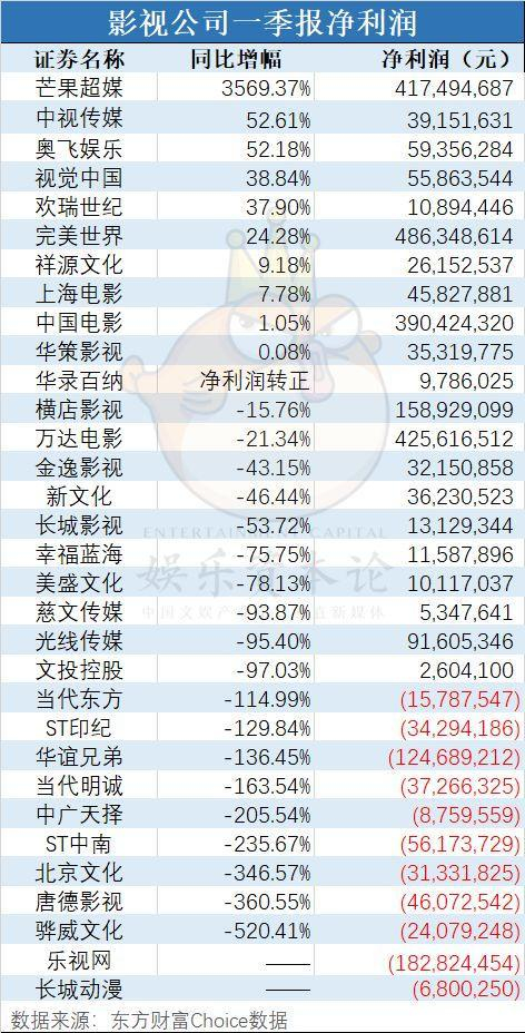 值得警惕的是,影视公司一季报成绩不算乐观,32家公司中19家净利润下滑,11家净利润亏损,包括华谊兄弟、北京文化、唐德影视、当代明诚(600136,诊股)等公司。