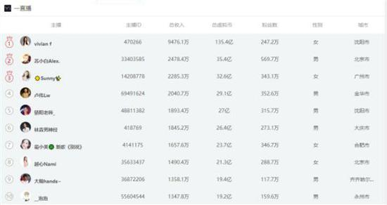“今日网红”网站给出的“一直播”主播收入排名榜显示,前十大网红,收入均超过了一千万元。