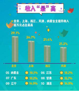 根据某社交平台发布的《2018主播职业报告》显示,21.0%的职业主播月收入超过万元,而兼职的主播仅3%。也就是说,八成左右的职业主播,收入不超过一万元。