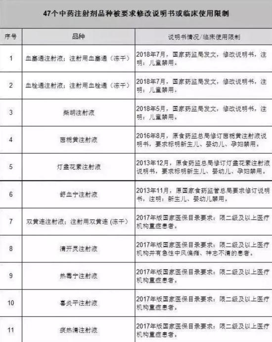 从2015年起,有超过47种中药注射剂被要求修改说明书或临床使用限制。