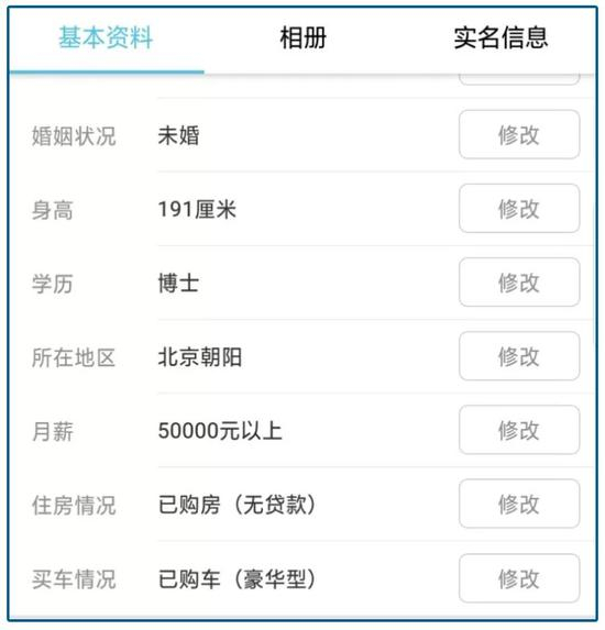 就算我把学历选为博士也不需要提交相关学历证书,就算离异过我也可以选择未婚,一名女会员上当受骗后称,“对方注册资料中,除了性别是真的之外,其他都是假的”。