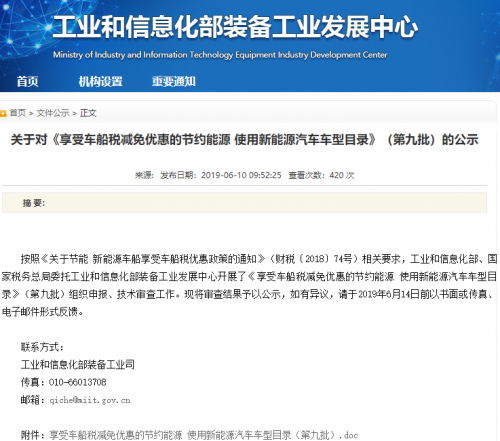 新浪财经讯 6月11日上午消息,工业和信息化部装备工业司昨日公示了《 享受车船税减免优惠的节约能源 使用新能源汽车车型目录》(第九批)。