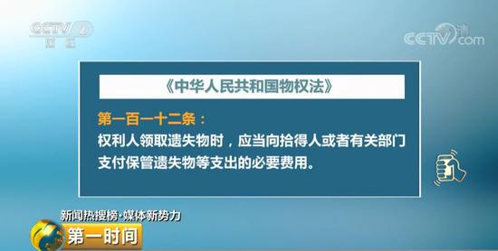 在律师指引下,央视财经记者查阅了相关法律法规,《中华人民共和国物权法》中第一百一十二条规定,权利人领取遗失物时,应当向拾得人或者有关部门支付保管遗失物等支出的必要费用。