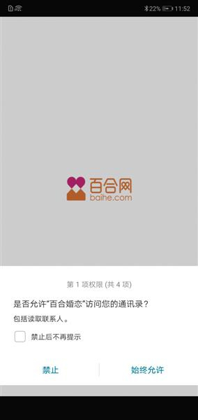 与之类似的还有百合婚恋。根据《信息规范》,婚恋相亲类APP可以收集手机号码、账号信息、个人基本资料等信息。但新京报记者首次打开百合婚恋后,该APP明示索取通讯录权限,相比之下,同属婚恋相亲类APP的世纪佳缘、珍爱网就没有索取通讯录权限。