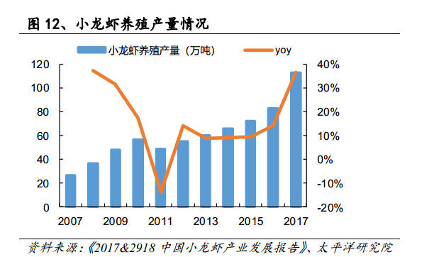研报分析称,2013年以前,小龙虾还只是湖北、江苏、湖南等地的区域性美食,2014年以来,小龙虾区域性品牌涌现、资本大量涌入、社交媒体宣传,小龙虾普及到全国。加之近几年小龙虾价格较高,消费者对小龙虾的消费热情高涨。未来,随着小龙虾供给增加、价格回归,小龙虾有可能复制当年坚果行业的发展路线,从奢侈走向日常,消费者逐步趋于理性。