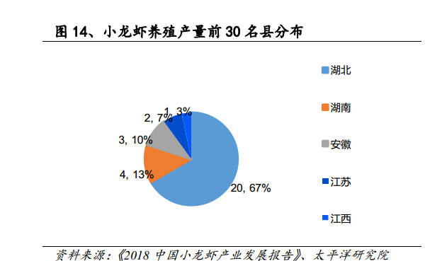 在全国小龙虾养殖产量前30名的县(市、区),小龙虾养殖总产量为73.49万吨,占全国小龙虾养殖总产量的65.05%。其中,湖北省监利县小龙虾产量为11万吨,是唯一产量超过10万吨的县。湖北荆州市(下辖监利县、洪湖市、石首市、荆州区、公安县、江陵县等均为小龙虾养殖产量前30)小龙虾产量占全国接近30%,是全国小龙虾的核心主产区。因为这里植被好、湖泊多、气候温和、土壤肥沃,是小龙虾的天然养殖场。