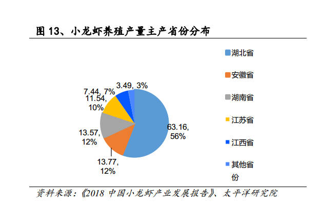 据统计,2017年,全国小龙虾养殖总产量为112.97万吨,湖北、安徽、湖南、江苏、江西分居前五,而这五个省份的小龙虾养殖产量占到全国总产量的96.91%。其中,湖北省的产量最大,占到55.91%。