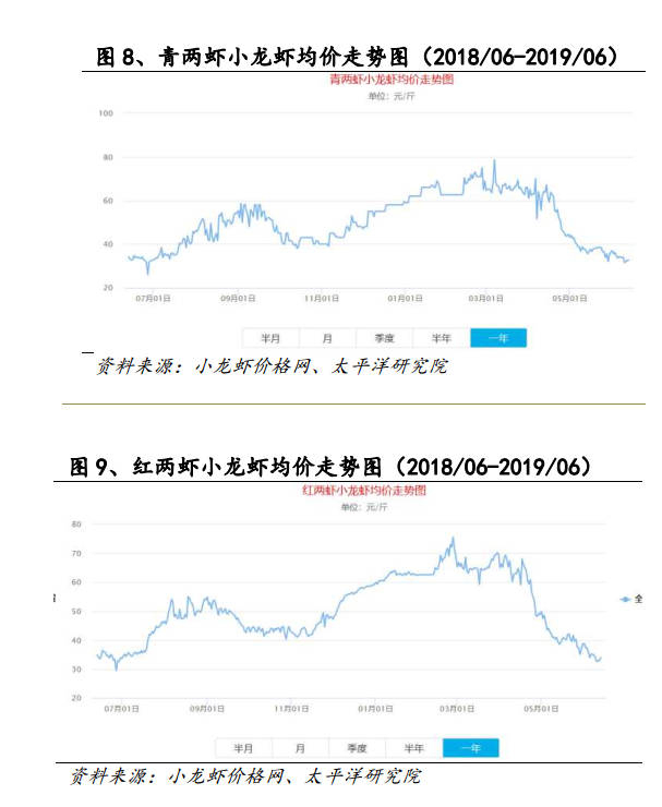 最近这些年来,小龙虾价格也因为市场供需变化而有所波动。据太平洋证券发布的研究报告,2017年,小龙虾价格走高,这主要受供给端影响,天灾人祸等导致的小龙虾产量减少。到了2018年,小龙虾价格高涨主要受需求端影响,世界杯、新社交打造爆品、餐饮巨头、电商巨头入局等导致小龙虾价格高涨。2019年上半年,之所以价格走低,主要是受供需两方面的影响,供给端养殖户增加、天气原因导致小龙虾集中上市,需求端经济下行、世界杯效应消失,消费回归理性,导致暂时的供大于求价格走低。2019年下半年,随着稻虾结束,各种湖虾、野虾产量也会急剧减少,7月份,小龙虾价格可能会缓慢回升。