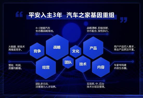 经过几年的磨合,团队成员基本具备几个显著特点:一是快速学习能力。他们是“多栖动物”,业务、职能,总部、子公司,金融、互联网,连续跨界、几进几出造就了他们的快速转换能力。二是跨界优势。平安的复杂管理和营销方法论对互联网可谓降维打击。三是强大的执行和协同文化。强调顶层规划与落地执行、体系化作战的企业文化,如今也已成为互联网大厂们下半场的转型共识。四是深谙互联网思维,熟稔汽车生态圈,对内容、创新与技术具有灵敏的嗅觉。