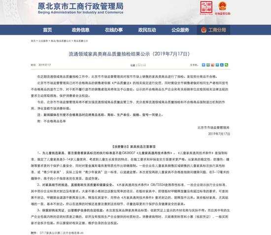 7月17日,原北京市工商行政管理局发布《流通领域家具类商品质量抽检结果公示(2019年7月17日)》称,在近期流通领域商品质量抽检工作中,北京市市场监督管理局对北京市市场上销售的家具类商品进行了抽检。发现部分商品不合格。