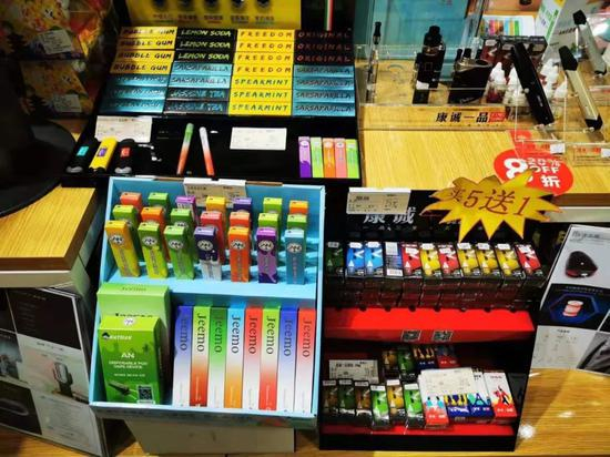 经过了两周对商场人流、位置的考量,吴萍(化名)在上海某商场开除了一家电子烟线下店。店面很小,只有一个货架,上面堆放着上百个电子烟烟杆和几十盒烟弹。消费者还可以尝试新的烟弹口味。