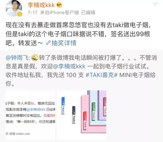 近日,电子烟行业消息不断。7月18日,有传闻称魅族科技高级副总裁李楠已经离职,创业做电子烟。但当事人李楠在微博上并没有对这则消息做出明确回应。其称:“现在没有去暴走做首席忽悠官、也没有去taki做电子烟。”吊诡的是,李楠竟在这则微博上宣传了一波taki电子烟,并转发了送出99根taki电子烟的活动。