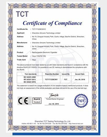 无独有偶,在不少电子烟的证书中,大多数的厂家都会提供电子烟的烟杆认证。电子烟杆的重金属含量等风险,自然是消费者关注的一个方面。但并不是所有厂商都会提供与烟油相关的认证。而烟油,则是直接摄入人体的部分。