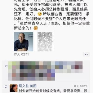 隔天,美图董事长蔡文胜发朋友圈声援自己在金山的老同事冯鑫。“一家公司能上市,最苦的一定是创始人,看起来风光,却承受最多挑战和艰辛。投资人都可以先套现,创始人必须坚持到最后。”蔡文胜也借冯鑫的遭遇警示其他创业者“任何时候都不要签个人无限连带责任”。