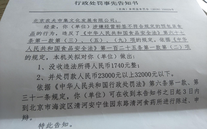 位于海淀五彩城附近的农夫市集社区店负责人潘达告诉记者,23000元对于这个一直挣扎于盈亏平衡线上下的社区店来说相当于几个月的纯利润。至于被罚原因,潘达说因为恶意举报。“虽然处罚是因为店面销售的小农加工品在标签上缺乏部分信息,但并没有任何欺骗消费者的不实信息,也不会产生任何食品安全事故。”