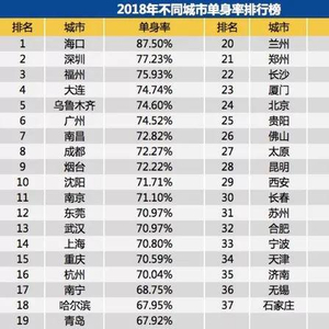 其中,海口的单身率最高,87.5%职场人是单身;福州以单身率75.93%稳坐第三位;厦门以单身率67.07%排在第23位。