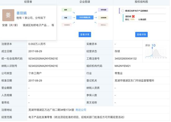 根据天眼查信息显示,这家公司注册于安徽省芜湖市,成立于2017年8月29日,注册资金仅为0.002万,商标权人为“镜湖区知桥电子产品销售部”。