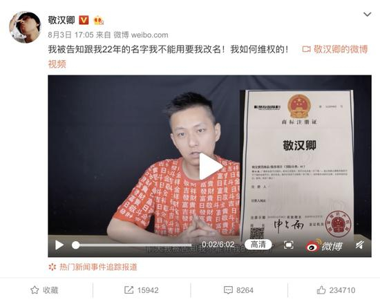 8月3日,敬汉卿在微博上发布了一段短视频说,他使用了22年的名字,被安徽一家公司注册了商标。对方告诉他,如果继续使用,将采取法律措施。