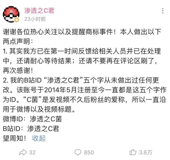 在敬汉卿这件商标事件后,不少短视频UP主陆续发了关于商标事件的声明。
