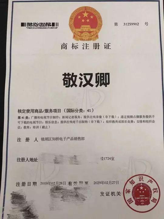 敬汉卿说,7月30日,他收到这家公司发的一封邮件。该公司在邮件中称,他们公司是“敬汉卿”注册商标持有人,并且商标被核定使用在第41类娱乐节目、视频节目制作和下载等服务上。