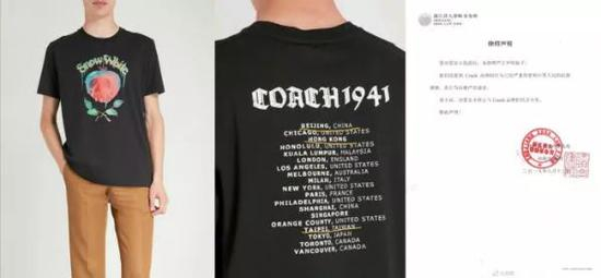 昨日范思哲事件的余波还未散去,8月12日凌晨,网名为“虹桥一姐”的网友又在新浪微博曝出Coach的一款T恤的印花文字将台湾对应了台北,将香港完全列为独立的板块。此外,该微博中还贴出Coach美国官网截图,指出在国家搜索栏中,Coach同样将香港、澳门和台湾与其他国家并列罗列。
