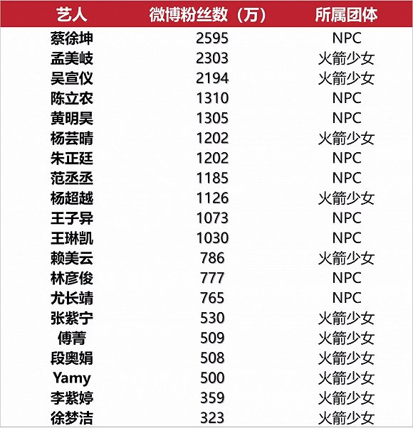 如果只看参加活动频次和音乐作品还不足以证明NPC和火箭少女的发展实力,微博粉丝数是他们人气、热度甚至是“带货能力”最直观的表达,从微博数据中可以看到,粉丝数量级超过2000万的头部偶像分别是蔡徐坤、孟美岐、吴宣仪,粉丝数量在1000万与2000万区间内的队员,NPC占了6席,火箭少女占了2席,总体而言,火箭少女的微博“圈粉力”不如NPC。