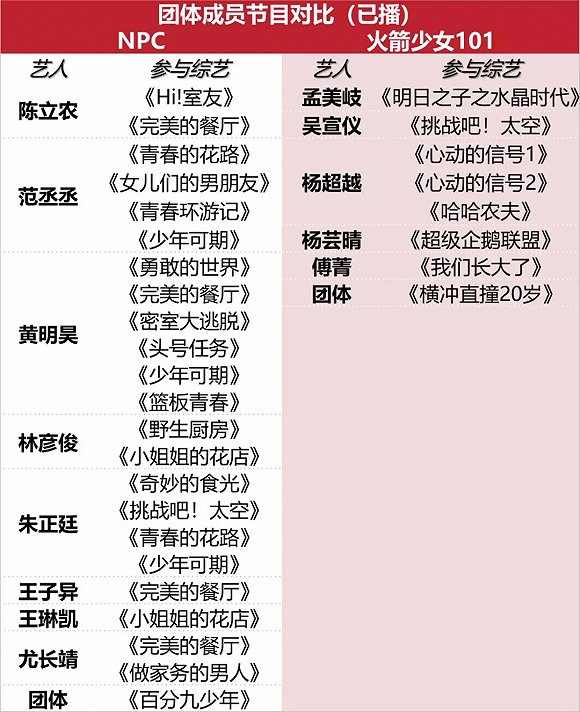 先来看NPC源自于外部的压力,从去年到今年,相继涌现男团20余个,竞争态势愈发激烈。除了上面提到的TFBOYS、NPC、UNINE、R1SE,还有坤音四子ONER、乐华七子NEXT、TFBOYS的师弟台风少年团等男团一同瓜分着偶像产业的大蛋糕。事实上,NPC不仅面临新锐男团的分流,还走入了与其他男团高度同质化的困境。例如,NPC有3位成员与乐华七子NEXT完全重合。
