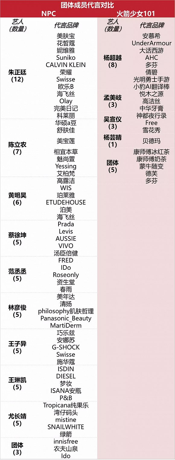从表中可以看出,NPC共拿下了3个团体代言,火箭少女共拿下了5个团体代言。其中,品牌代言数量排名前三名的分别是朱正廷12个、杨超越8个、陈立农7个。值得关注的是,NPC九人中每人至少拿到了5个代言,而火箭少女的代言资源集中在头部队员,杨超越、孟美岐、吴宣仪在个人资源上碾压同队,杨芸晴拿下一个代言,剩下7位“颗粒无收”。代言数量其实与公众知名度有很大关系,品牌更倾向于找国民度高的,如果出不了圈,很难成为广告主的香饽饽。
