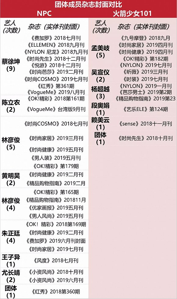时尚资源被视作商业价值的体现,它只看重艺人的号召力,并不在乎你的业务能力是否好,只要有影响力、转化率,时尚圈就会认可你。NPC和火箭少女自成团以来出席了多场时尚活动和拍了不少时尚杂志。从团体来看,两家在杂志封面数量上基本持平。而从个人来看,男团这边蔡徐坤一人拿下9个封面,女团这边并没有势均力敌的对手,男团除了王琳凯之外都拿到了个人封面,女团还有6位队员“虚位以待”。